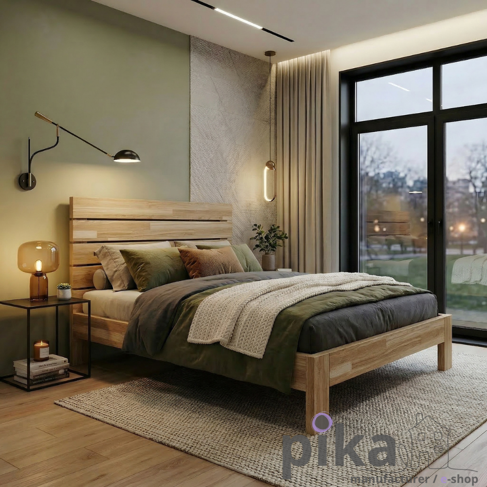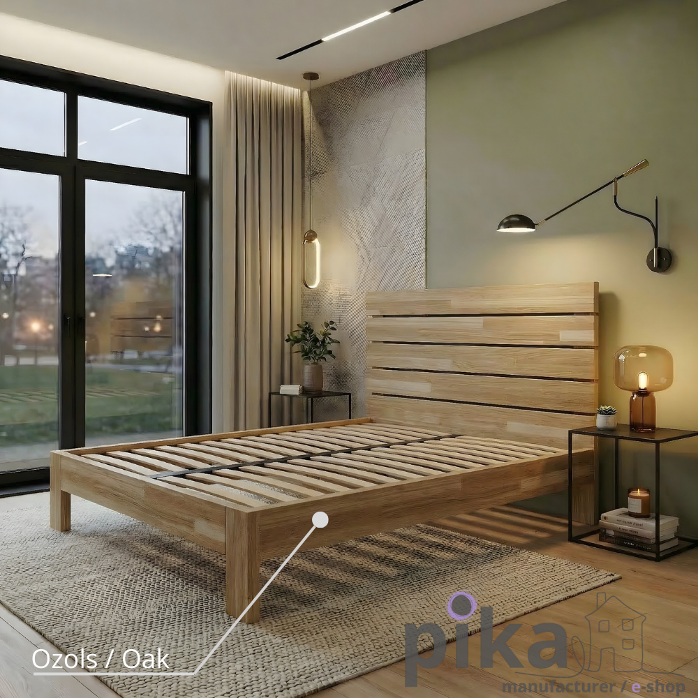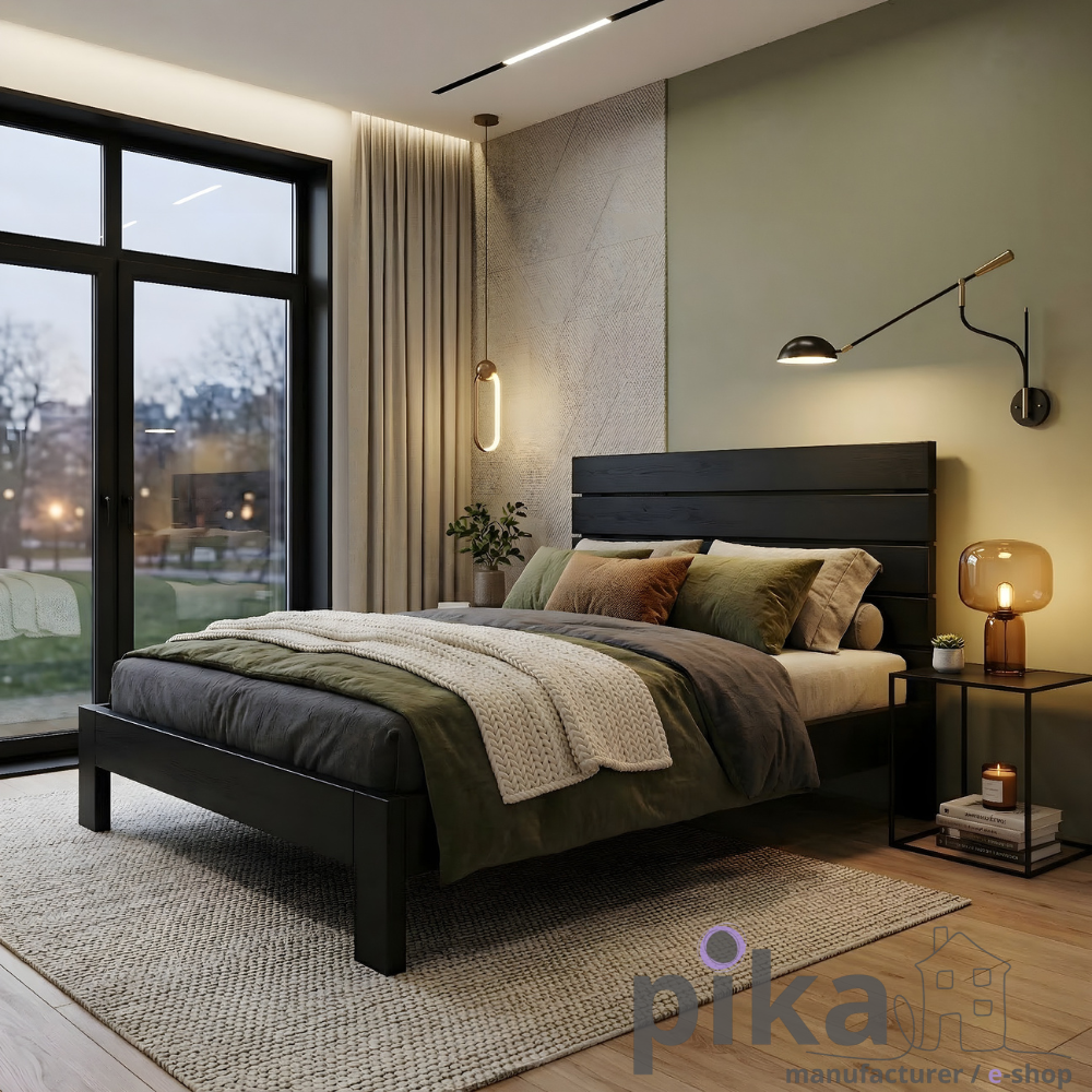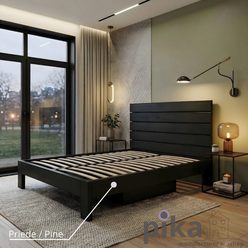 kas apvieno skandināvu dizaina vienkāršību ar modernu un izteiksmīgu raksturu. Tās tīrās līnijas un masīvā konstrukcija rada stabilu un mierpilnu guļamistabas atmosfēru, vienlaikus piešķirot interjeram dziļumu un kontrastu.