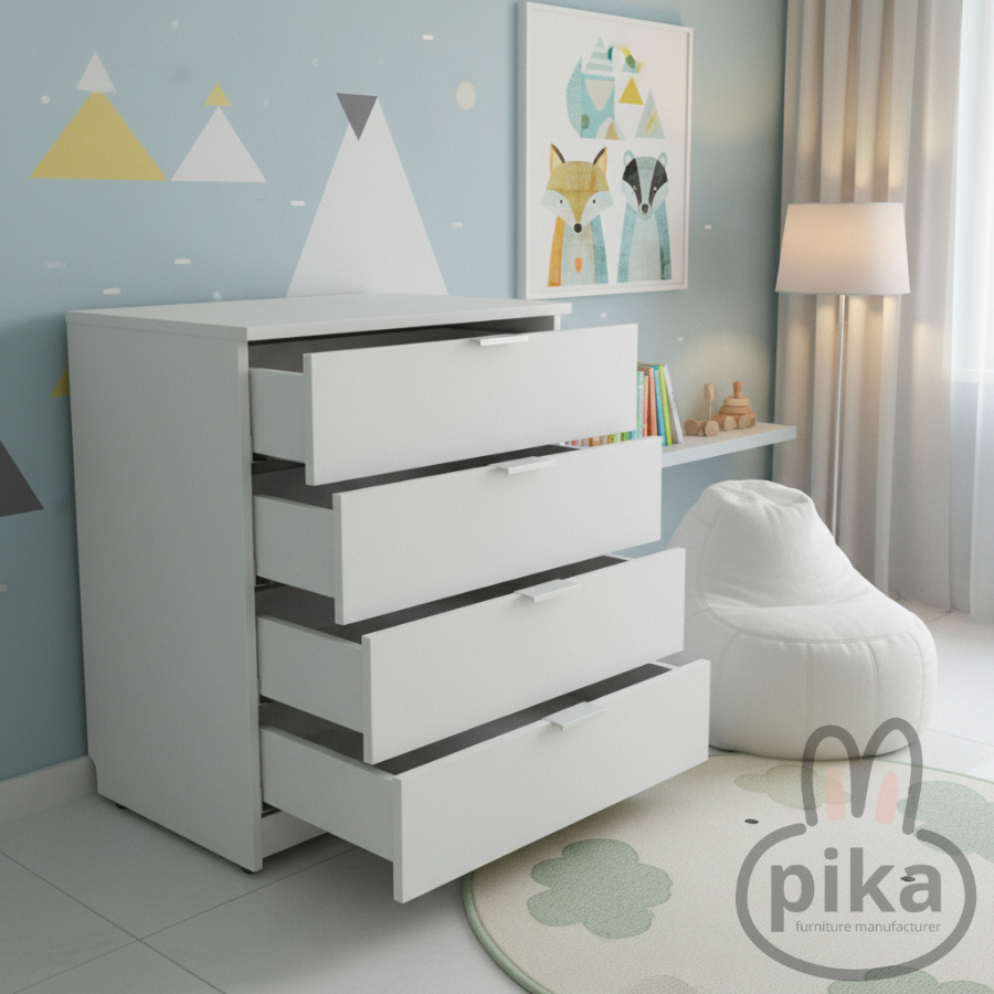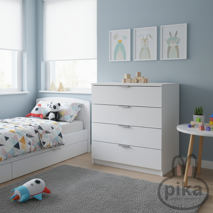 • Metāla rokturi – izturīgi un eleganti, piešķir kumodei modernu vizuālo akcentu.